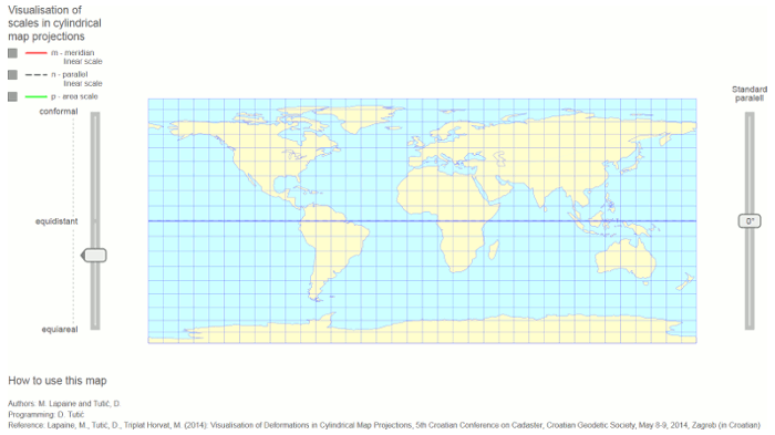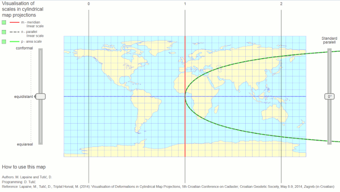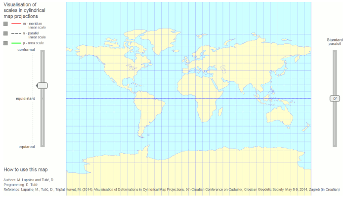 By draging two sliders on the side of the map user controls the parameters of cylindrical projection.